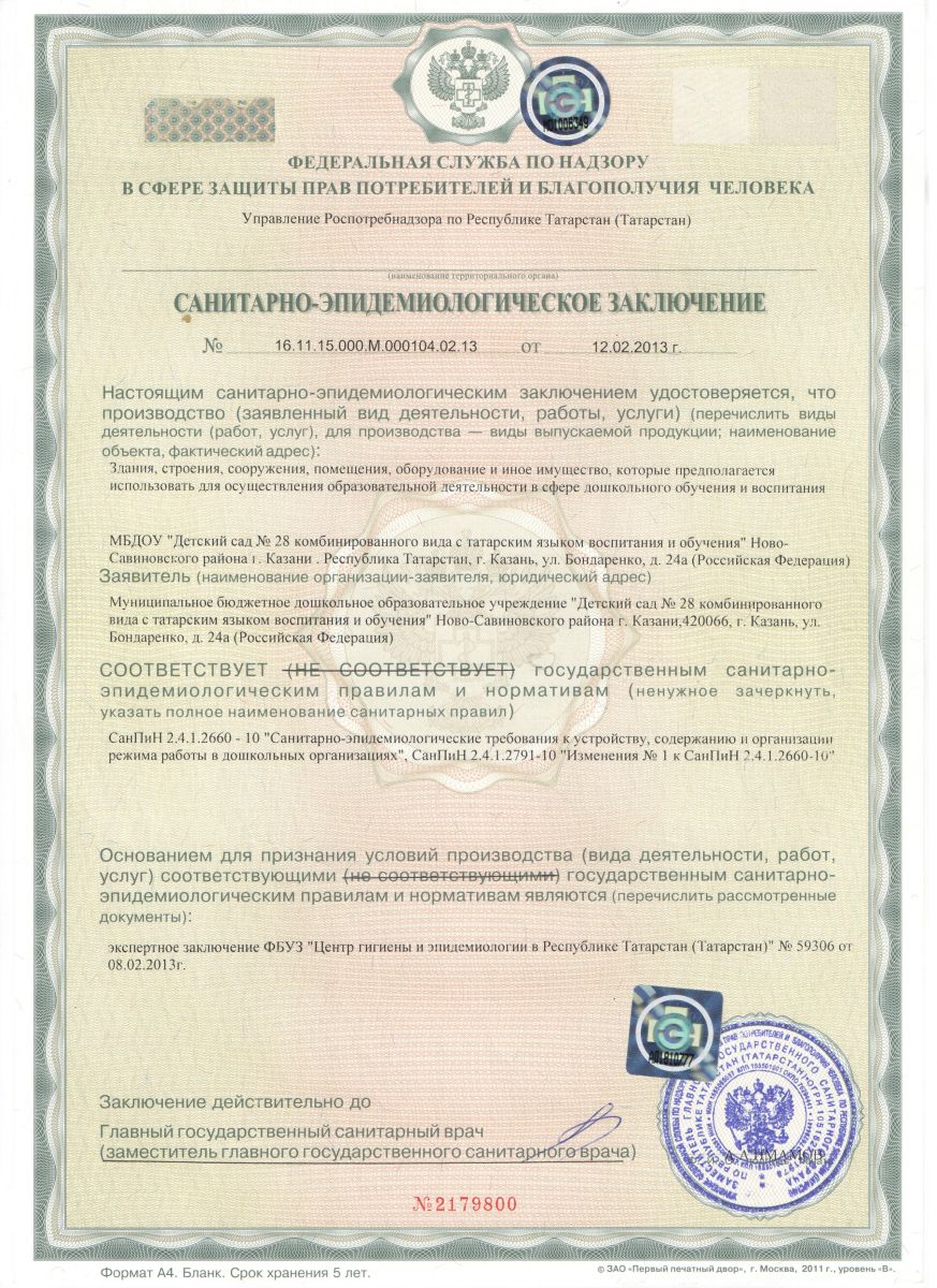 Санитарно-эпидемиологическое заключение о соответствии МБДОУ "Детский сад № 28" государственным санитарно-эпидемиологическим правилам и нормативам