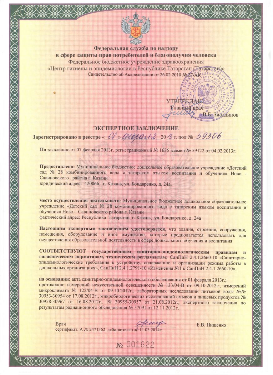Экспертное заключение о соответствии МБДОУ "Детский сад № 28" государственным санитарно-эпидемиологическим правилам и гигиеническим нормативам, техническим регламентам