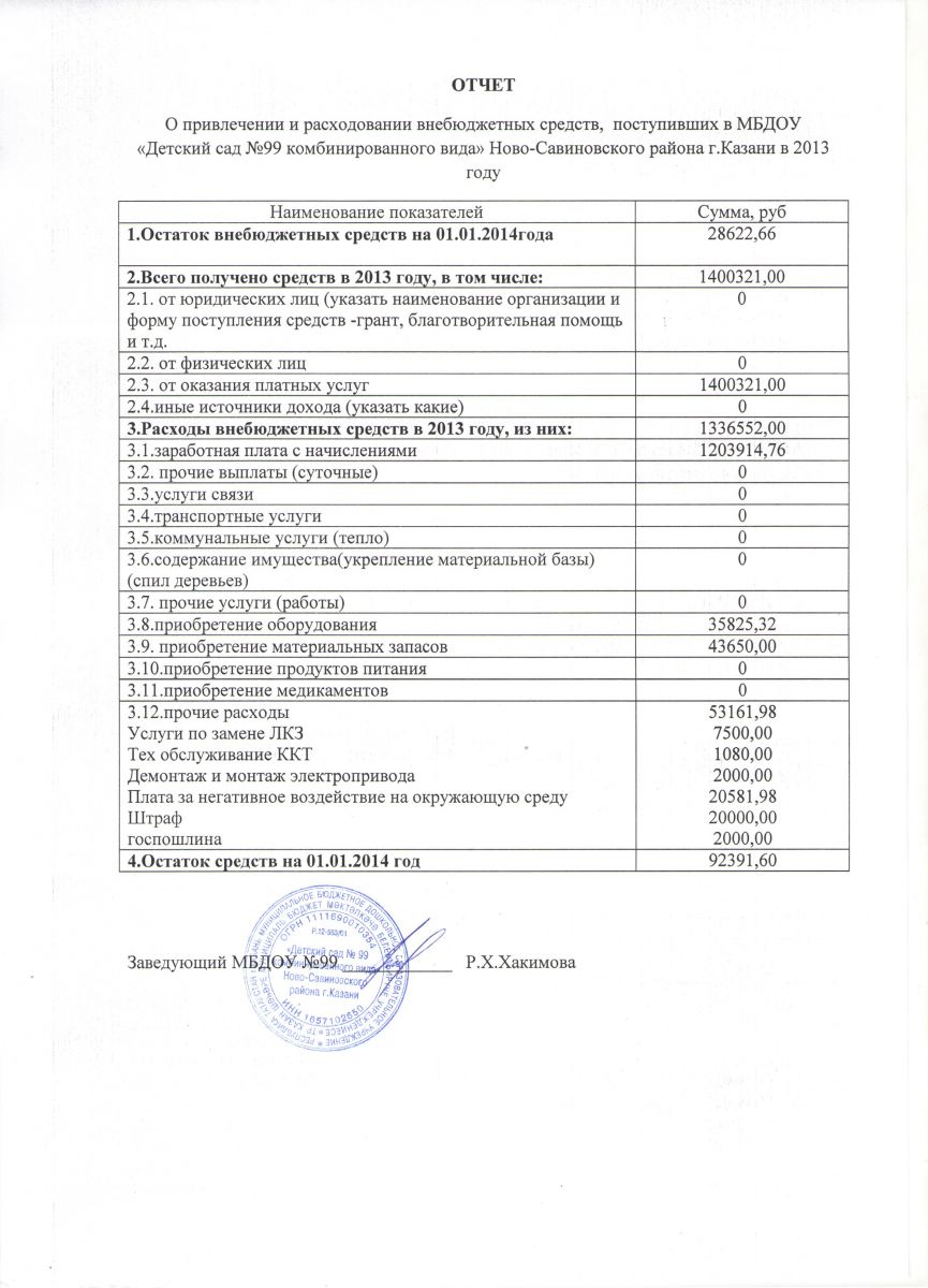 Отчет о привлечении и расходовании внебюджетных средств, поступивших в МБДОУ "Детский сад №99 комбинированного вида" в 2013году