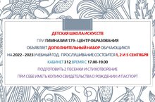 Детская школа искусств при МБОУ "Гимназия №179-ЦО" объявляет ДОПОЛНИТЕЛЬНЫЙ НАБОР обучающихся на 2022-2023 учебный год. Прослушивание состоится 1,2 и 5 сентября, кабинет 312, время с 17.00-19.00. Подготовить 2 песенки и стихотворение. При себе иметь копию свидетельства о рождении и паспорт.
