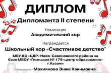 В рамках первого Открытого фестиваля-конкурса хоровых коллективов, посвящённого Году педагога и наставника Голоса Первых школьный хор нашей гимназии "Счастливое детство" стали дипломантами 2 степени в номинации "Академический хор"! Руководитель- Махиянова Энже Хакимовна.Поздравляем!!! Желаем новых побед и достижений!