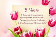 Поздравляем вас с прекрасным весенним праздником — с Днем 8 марта! Желаем огромного счастья, высоких достижений в жизни и успехов во всем! Чтобы всегда радовали нас своей обворожительной улыбкой и сногсшибательной красотой! Скорейшего наступления весенних деньков и яркого солнышка! Исполнения желаний и ярких положительных эмоций!