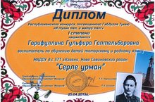 Поздравляем нашего воспитателя по обучению татарскому языку Гарифуллину Гульфиру Гаптельбаровну с Дипломом I степени на республиканском конкурсе, посвящённому Габдулле Тукаю "И туган тел, и матур тел!" Желаем дальнейших побед и открытий!