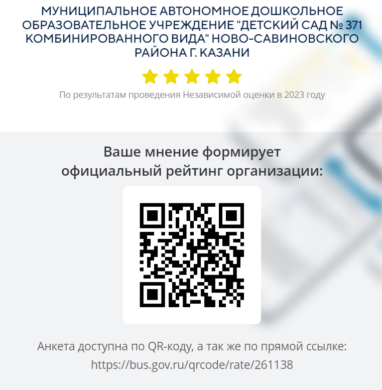 Опубликовано: 29.09.2023В соответствии с письмом заместителя Министра просвещения Российской Федерации Д.Е.Грибова от 22.09.2023 № ДГ-2226/02, в целях повышения охвата населения системой независимой оценки качества условий оказания услуг организациями социальной сферы. QR-код для прохождения независимой оценки в соответствии с разработанными Минтрудом России общими требованиями и методическими рекомендациями.