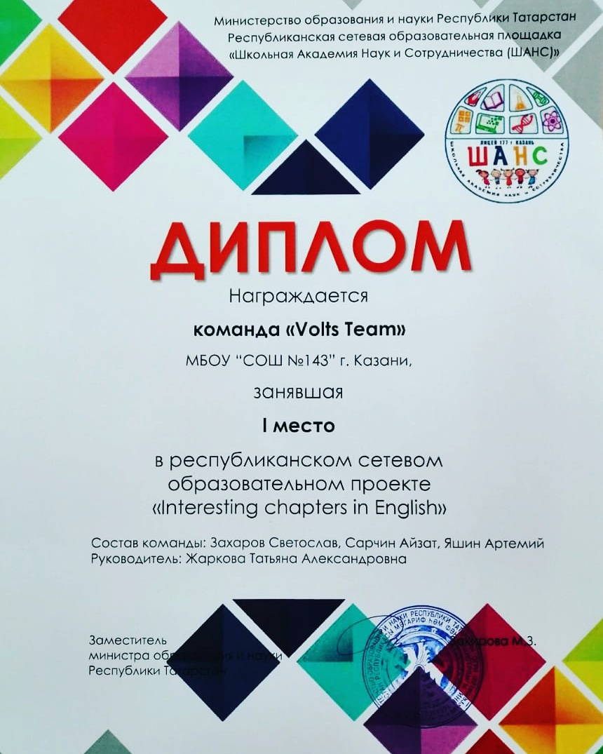 Поздравляем учащихся 7 "Б" класса :Захаров Святослав, Сарчин Айзат,Яшин Артемий и их руководителя,Жаркову Татьяну Александровну с ПОБЕДОЙ-1 МЕСТО в Республиканском сетевом образовательном проекте:"Interesting chapters in English".