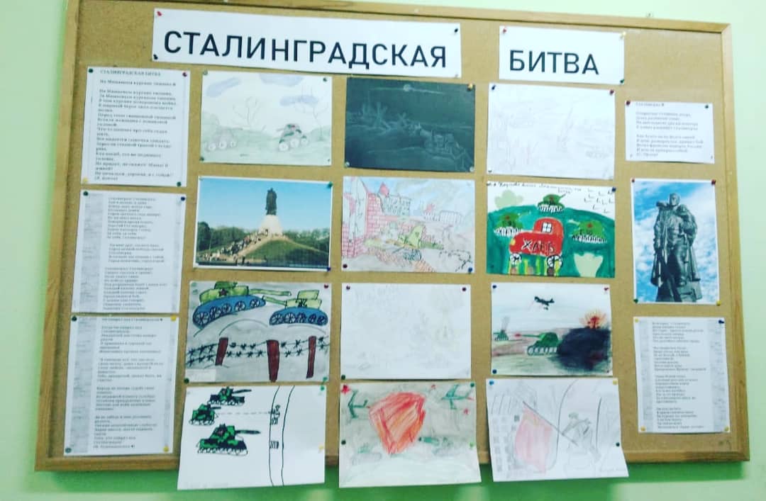 На втором этаже, учащимися начальных классов, организована выставка рисунков, посвящённая Сталинградской битве.