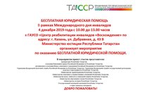 Министерство юстиции Республики Татарстан 4 декабря 2019 года с 10:00 до 13:00 организует БЕСПЛАТНУЮ ЮРИДИЧЕСКУЮ ПОМОЩЬ в рамках Международного дня инвалидов.