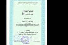 Поздравляем ученика 5Б класса Галеева Инсафа с победой в X турнире юных математиков имени Н.И. Лобачевского.