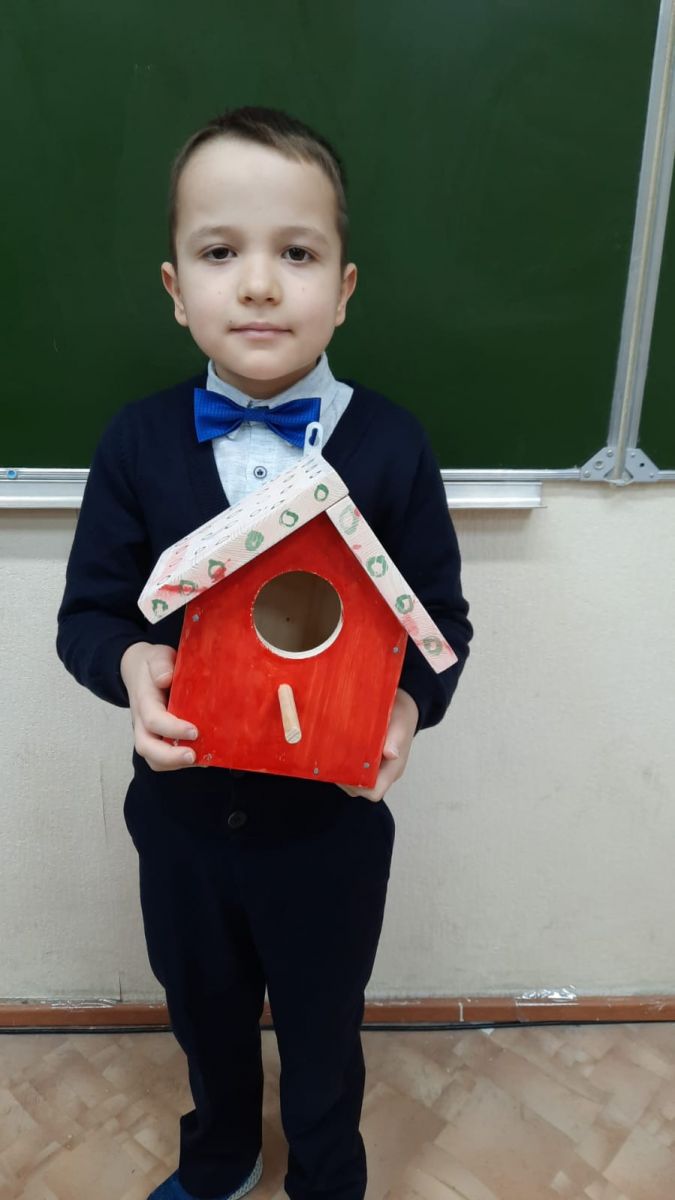 Зарипов Тимур,ученик 1 "А" класса принимает участие в экоконкурсе:"Накормим птиц зимой!" в номинации " скворечник".
