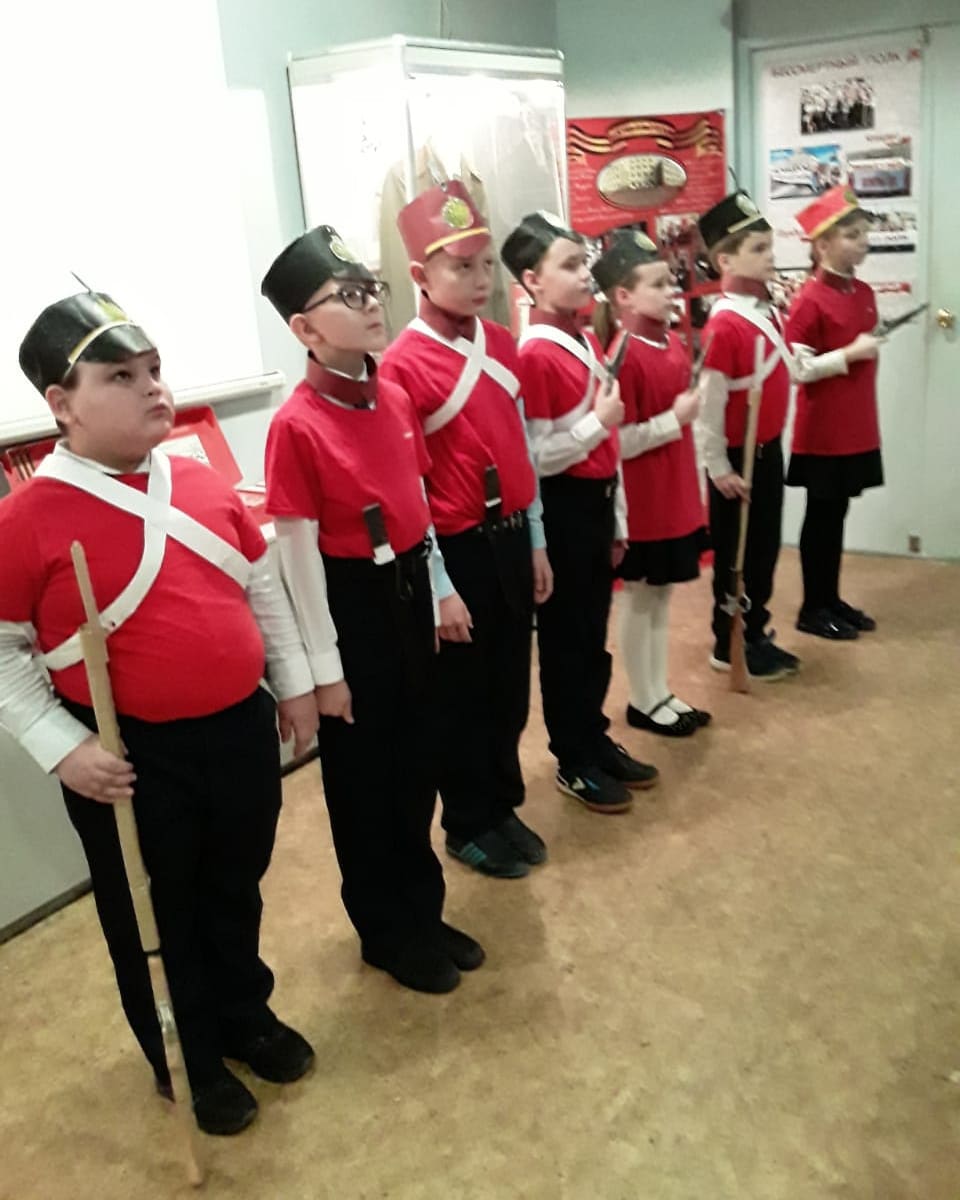 Кружковцы 4 "а" класса" Юный патриот России", педагог Нечаев И.Н в форме и с вооружением солдат 1812г.М.Ю.Лермонтов Бородино.