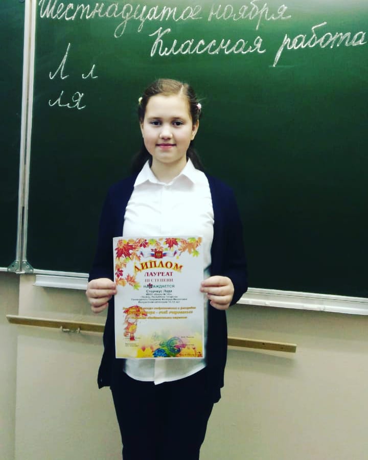 Поздравляем ученицу 4"А" класса, Сторчеус Ладу и классного руководителя, Миляушу Мисхатовну с Победой,во Всероссийском конкурсе изобразительных и фоторабот "Осенняя пора-очей очарованье" в номинации "Изобразительное искусство".
