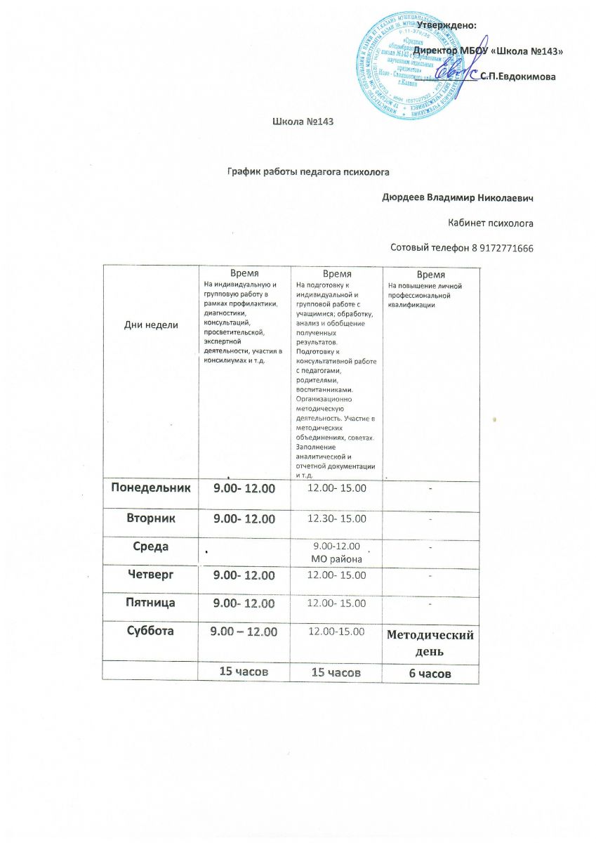 График работы педагога-психолога МБОУ "Школа №143" на 2017-2018 учебный год