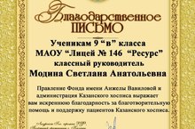 Благодарственное письмо от фонда имени Анжелы Вавиловой и руководства хосписа получили учащиеся 9В классам и классный руководитель Модина Светлана Анатольевна, которые оказали в ноябре 2019 года благотворительную помощь маленьким пациентам хосписа, собрав необходимые для них вещи.