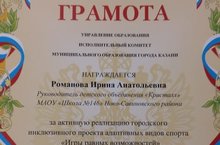 Поздравляем руководителя школьного отряда «Самостоятельные дети» Романову Ирину Анатольевну с вручением ей грамоты Управления образования Казани за активную реализацию городского инклюзивного проекта адаптивных видов спорта «Игры равных возможностей» и межведомственного антинароктического проекта «Самостоятельные дети»