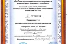 Шәһәр күләмендә үткәрелгән Д.С.Лихачев исемендәге фәнни-тикшеренү конференциясендә 6а класс укучысы Шәймәрданова Лилия “Татар халык мәкальләре” темасына чыгыш ясап, II дәрәҗә дипломга лаек булды. Тикшеренү эшенең фәнни җитәкчесе- Роза Николаевна иде. Укучысының хезмәте нәтиҗәле уңышлар яулавы – фәнни җитәкче өчен дә зур җиңү. Иҗади уңышлар Сезгә Роза Николаевна һәм Лилия!