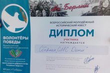 В субботу 16 апреля ученицы 7Б класса (члены движения СМС-дети) Мочкарина Настя и Архипова Настя приняли участие в молодёжном историческом квесте «На Берлин!». Квест был проведён в Парке им.М.Горького нашим региональным отделением Всероссийского общественного движения «Волонтёры Победы».