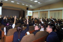 25 ноября 2014 года психологом Садыковой М.И. и педагогом-организатором Габдрахмановой Э.Н. с учениками 6х классов была проведена деловая игра «Курение: за и против» (в рамках Всемирного Дня отказа от курения). В ходе игры дети научились формулировать свои суждения, выработали общее мнение о том, что все аргументы «за» курение – миф, выдумка и обман. Итогом деловой игры стало выполнение учениками проектных работ под девизом «МЫ – ПРОТИВ!»