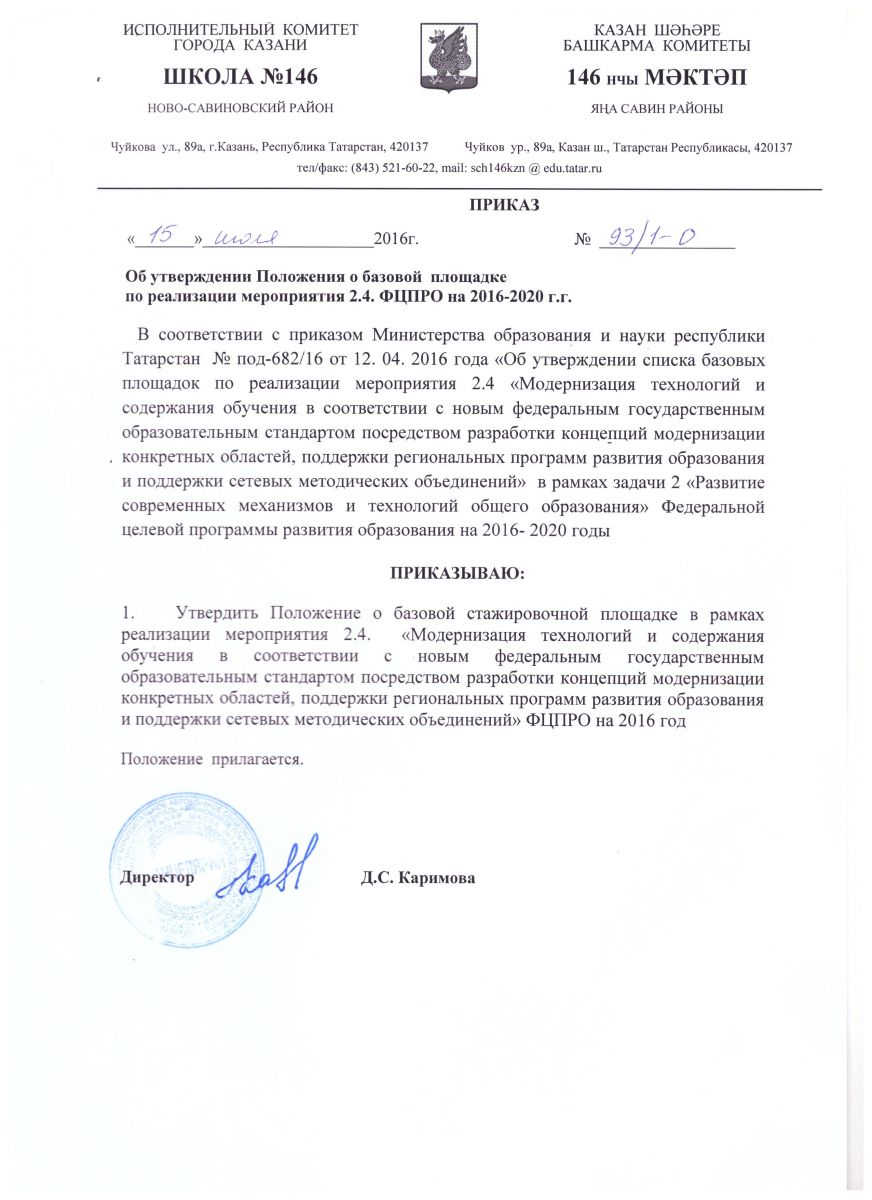 Приказ об утверждении Положения о базовой площадки ФЦПРО на 2016 - 2020 годы