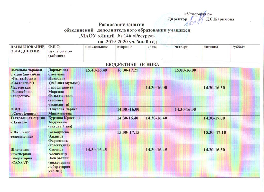 Расписание занятий объединений дополнительного образования учащихся МАОУ "Лицей №146 Ресурс" на 2019-2020 учебный год.