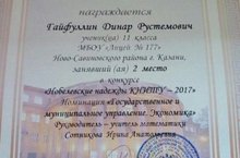 В конкурсе "Нобелевские надежды КНИТУ- 2017" несколько наших учеников, а именно, Муллагалиева Раяна, Миннегалиев Надир, Гайфуллин Динар, Сибгатуллин Имам заняли призовые места в разных номинациях, мы гордо можем сказать, что у нас в школе учатся юные учены с большими перспективами.