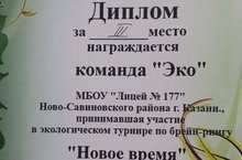 Команда учеников лицея №177 во главе с их руководителем, Сергеева С.В., результативно приняли участие в экологическои турнире по брейн-рингу "Новое время". Наша команда, под названием "Эко" заслуженно заняла 3 место, с чем мы их поздравляем! Спасибо все за работу!