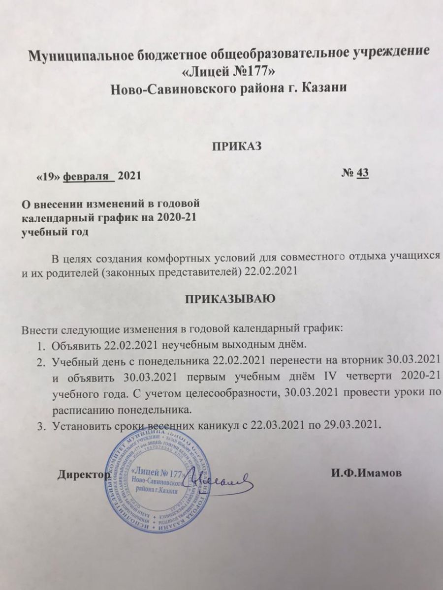 В целях создания комфортных условий для совместного отдыха учащихся и родителей (законных представителей) 22 февраля 2021 года объявлен неучебным днем ПРИКАЗ №43 от 19.02.21.