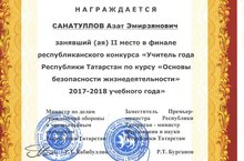Поздравляем Азата Эмирзяновича Санатуллова, преподавателя-организатора ОБЖ, занявшего II место в финальном этапе республиканского конкурса «Учитель года Республики Татарстан по курсу «Основы безопасности жизнедеятельности» 2017-2018 учебного года. Мы гордимся нашим педагогом!