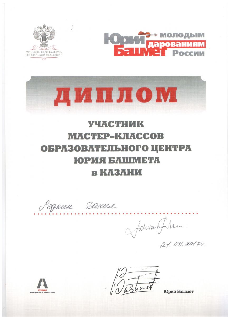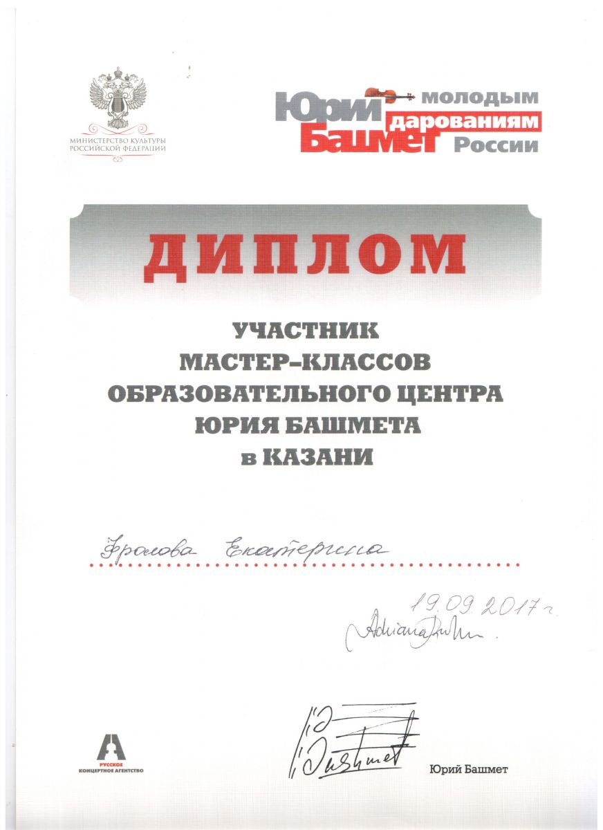 Опубликовано: 19.09.2017Учащиеся ДМШ №13 Фролова Екатерина и Редкин Данил, класс преподавателя Черновой М.Н., приняли участие в мастер-классах образовательного центра Юрия Башмета "Молодым дарованиям России".