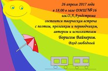 26 апреля 2017г. в зале ДМШ №16 им. Олега Лундстрема состоялась творческая встреча с поэтом, прозаиком, переводчиком, автором и исполнителем Борисом Вайнером.