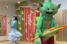 Сегодня в гости к ребятам приезжали весёлые клоуны Плюх и Батон. Они прокатили ребят на своём паровозике, а так же поиграли и посмешили детей! Встреча получилась интересной и радостной.