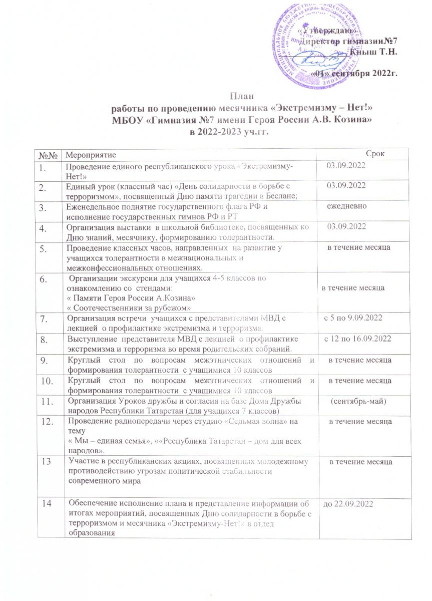 План месячника "Нет экстремизму" на 2022/2023 учебный год