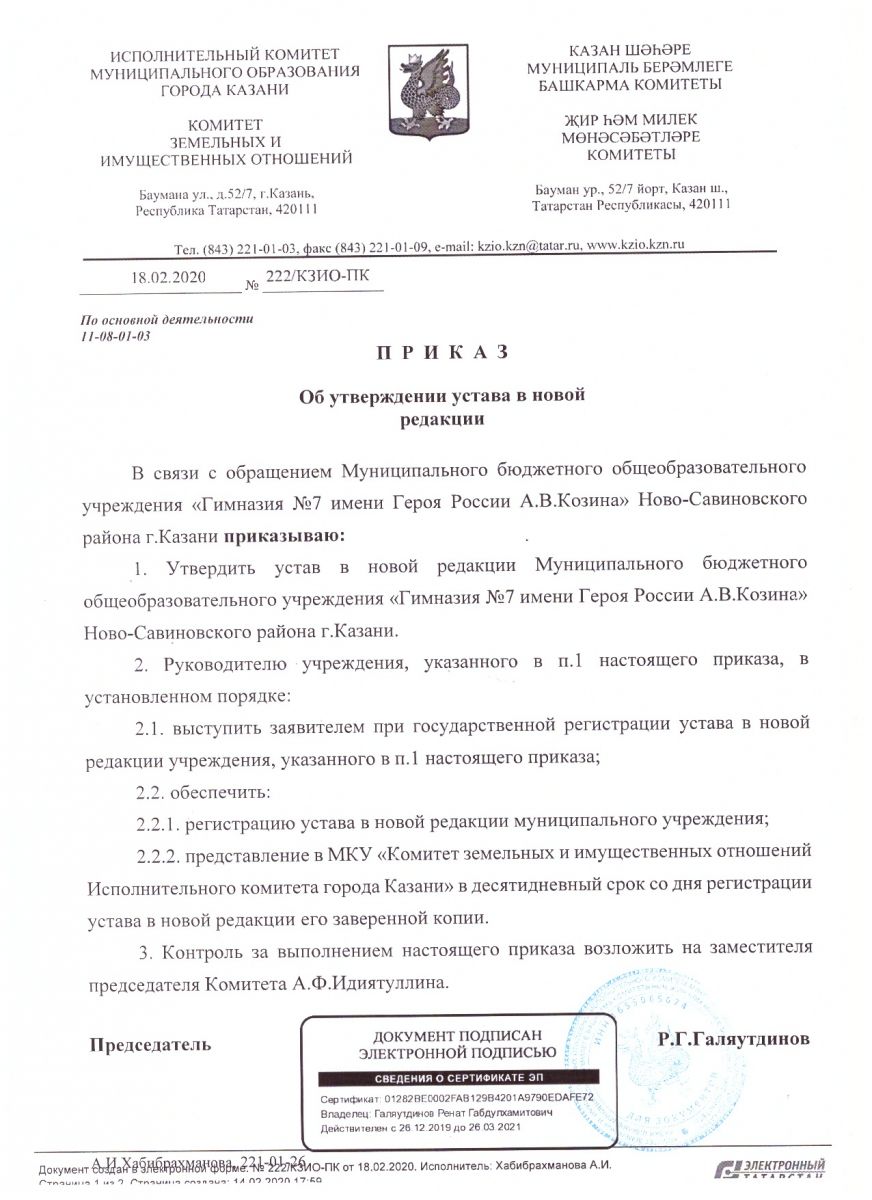Новый Устав от 18.02.2020г.; приказ об утверждении Устава в новой редакции 2020г.