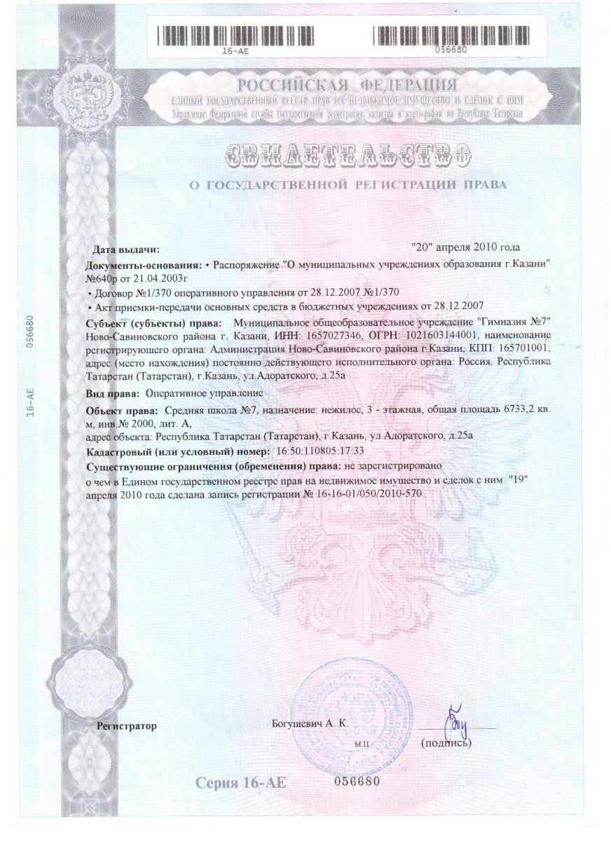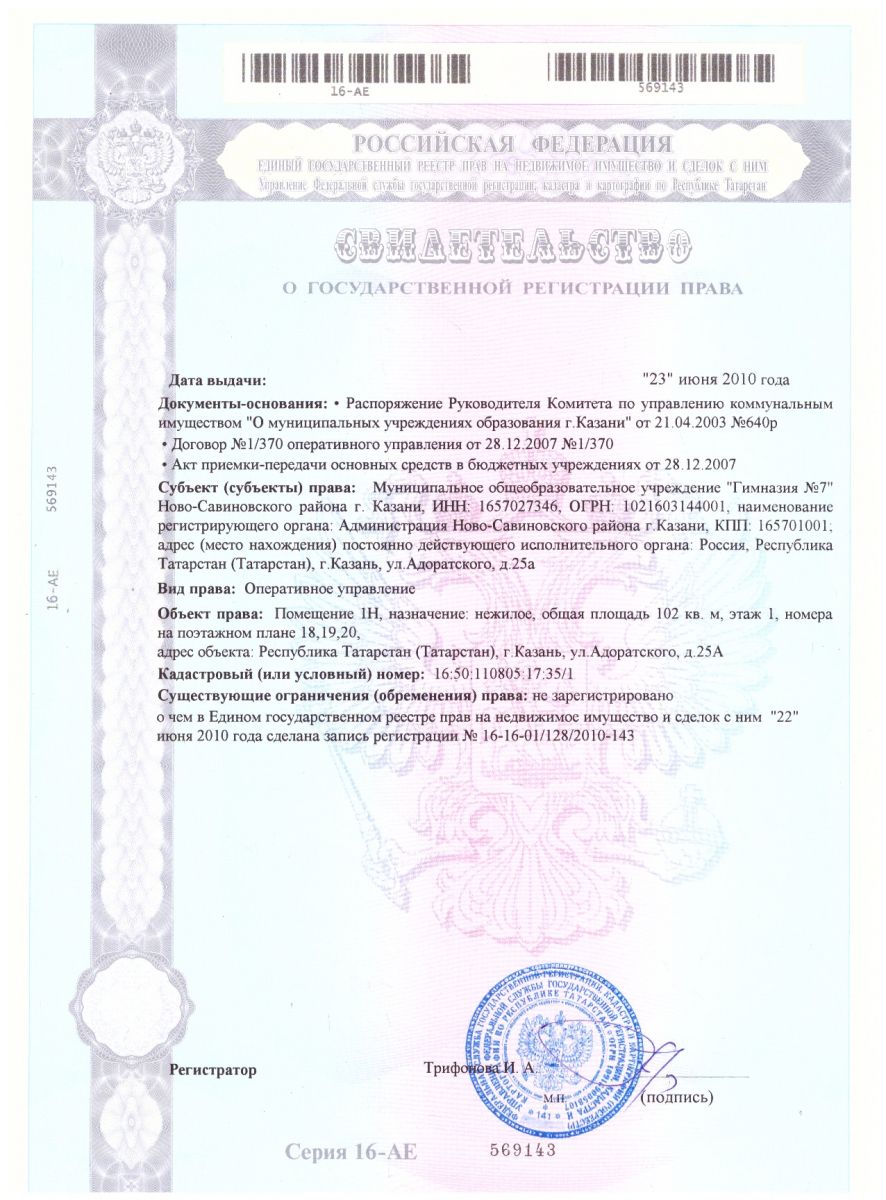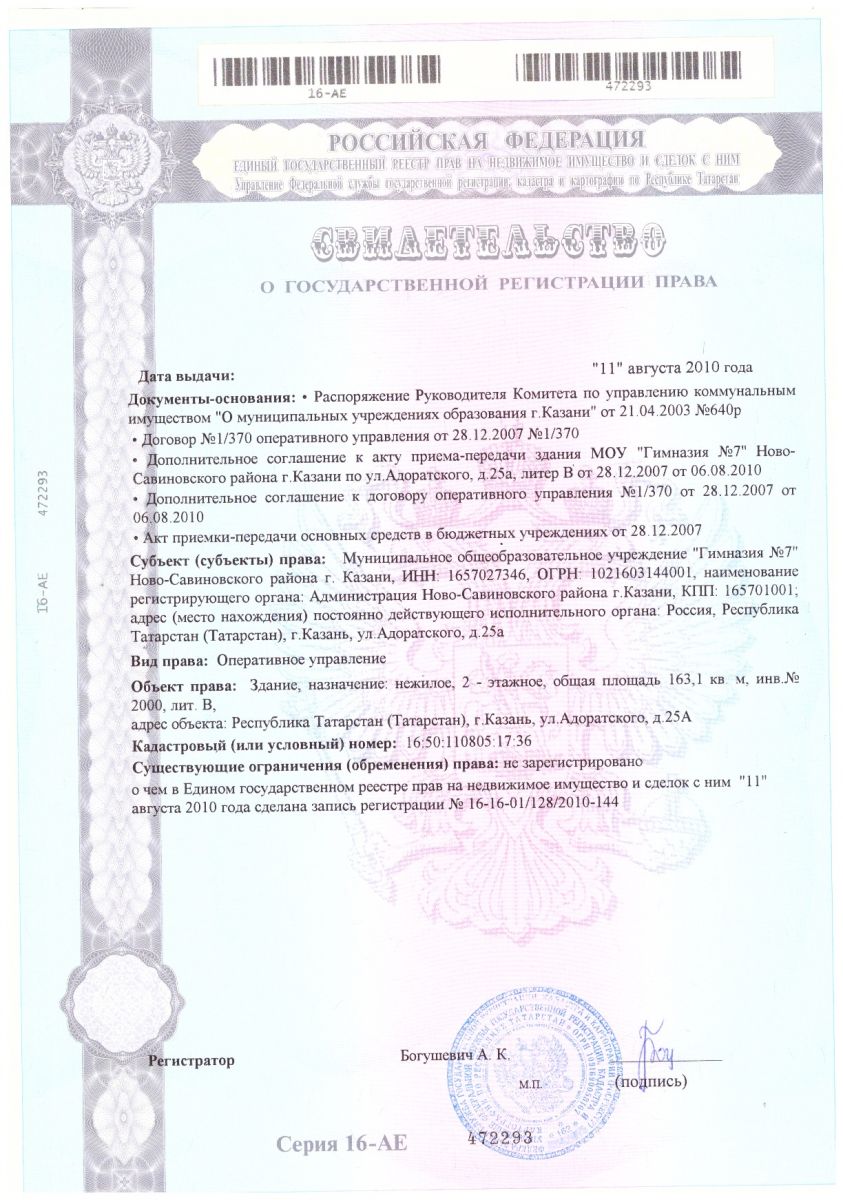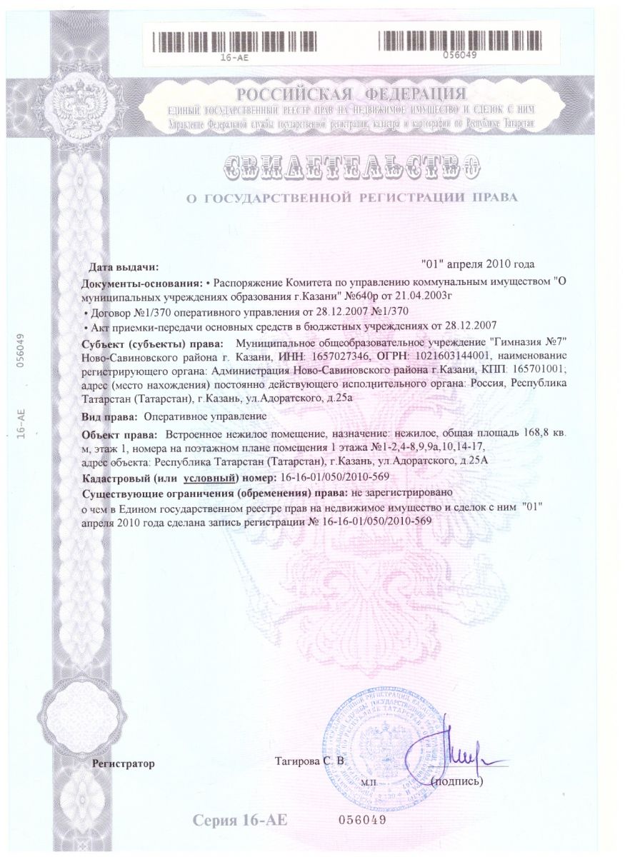 Свидетельство о государственной регистрации права (встроенное нежилое здание, музыкальная школа)