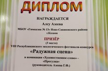 Ученица 1А класса нашей гимназии Азеева Алсу приняла участие в VIII Республиканской экологической фестивале-конкурсе "Радужная сцена" и заняла 3 место в номинации "Художественное слово" - "Прогулка". Поздравляем и желаем дальнейших побед!