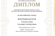 Безнең горурлыгыбыз, инглиз теле буенча олимпиаданың төбәк этабы җиңүчесе, рус теле, МХК, җәмгыять, рус теле буенча мәктәп укучылары өчен рус теле буенча региональ һәм республика олимпиадалары призеры Гыйззәтуллина Альмираны котлыйбыз. Без сиңа инглиз теле буенча олимпиаданың Бөтенроссия этабында җиңүләр телибез. Син безнең йолдызыбыз!
