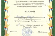 2023 елның 22 мартында балалар һәм яшүсмерләр туризмы һәм экскурсияләр йортында СССРның 100 еллыгына багышланган "Казан Бөек төзелешләр эш көннәрендә" проекты кысаларында яшь экскурсоводлар шәһәр конкурсының район этабы узды. "Мәктәп музее активистлары" түгәрәгендә катнашучылар Симаков Семен һәм Алексей Липова ( җитәкчеләре Н. г. Овчинникова һәм Р.Н. Алимова) беренче урынны яуладылар. Котлыйбыз!
