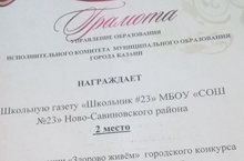 Управлением образования исполнительного комитета города Казань была вручена грамота нашей школьной газете "Школьник №23" за 2 место в номинации "Здорово живем" городского конкурса детской и юношеской прессы "Без права на ошибку". Молодцы, ребята!
