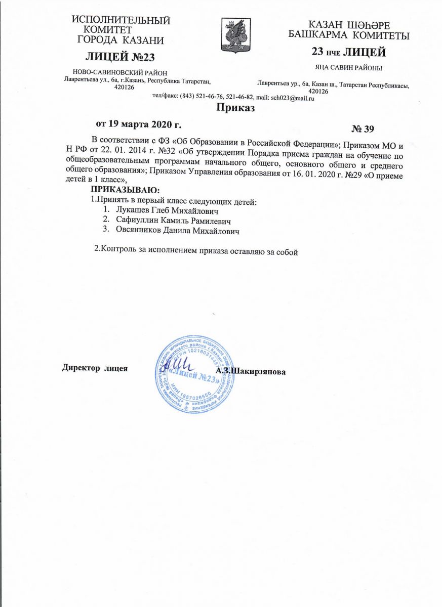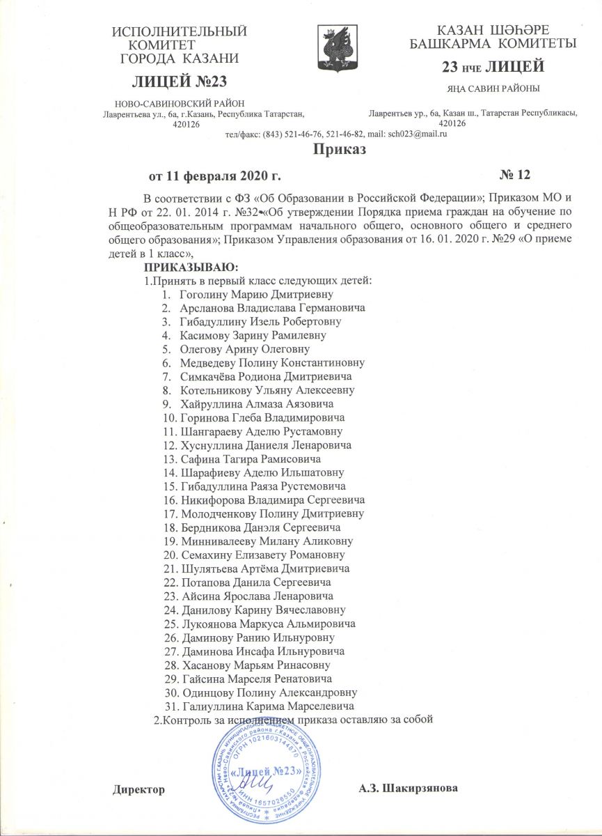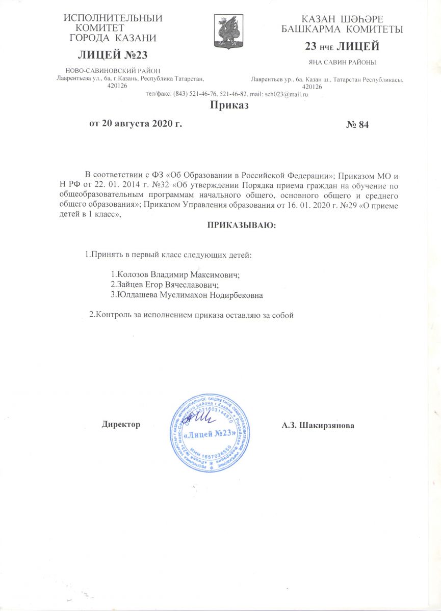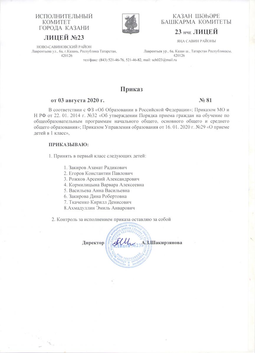 Приказ "О приеме детей в 1 класс МБОУ "Лицей №23"