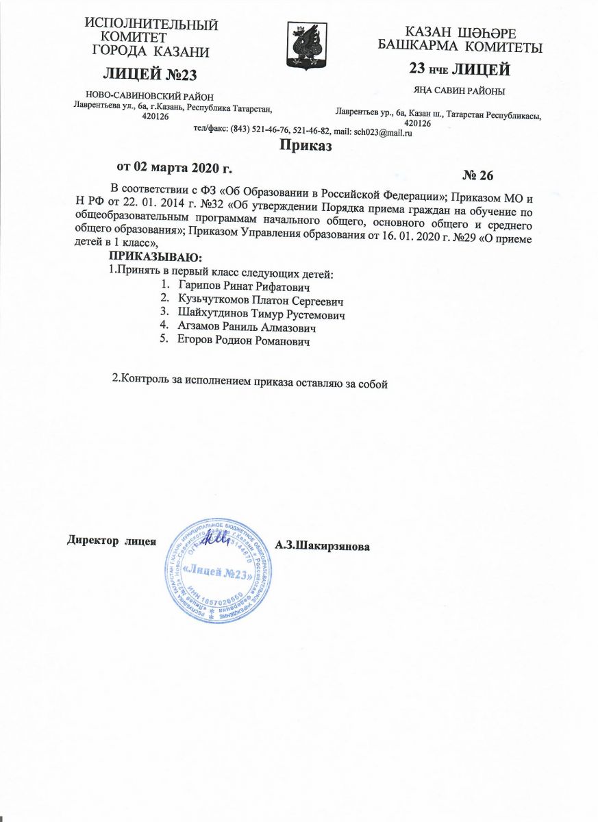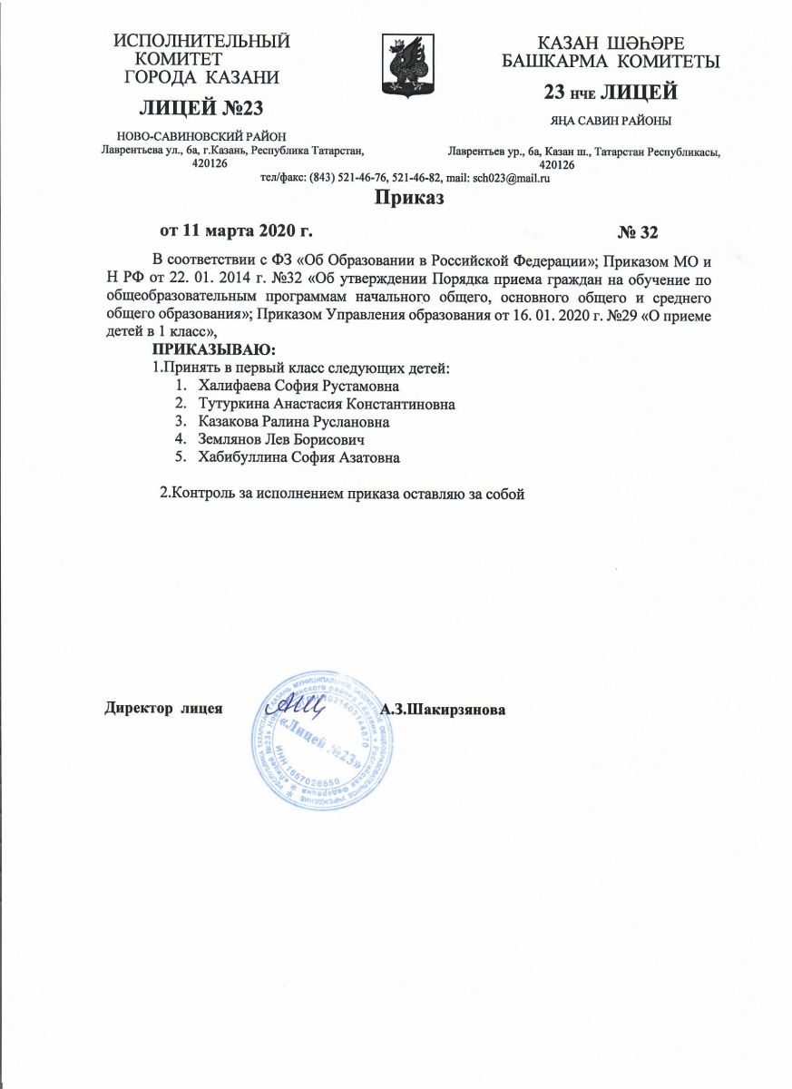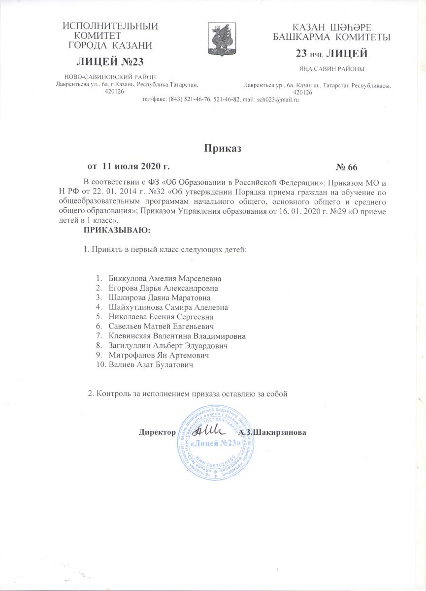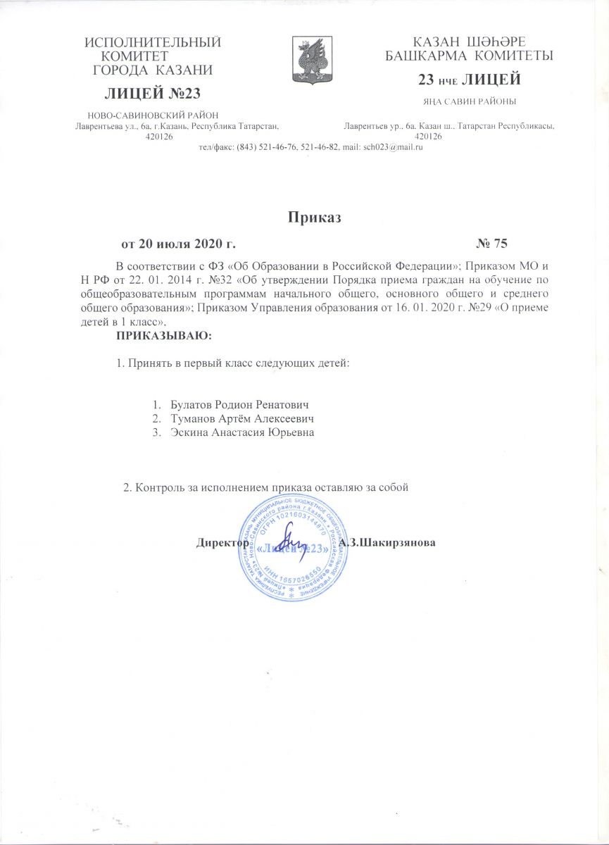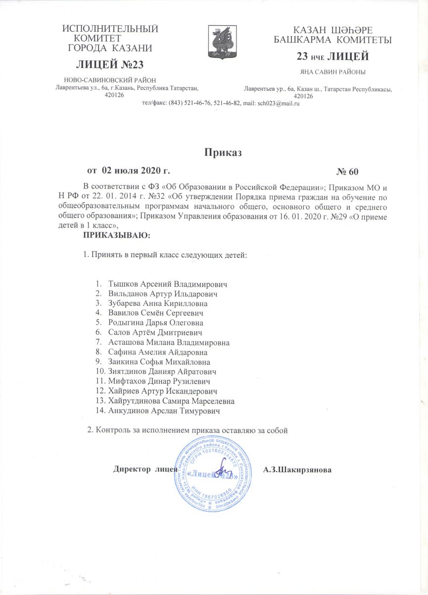 Приказ "О приеме детей в 1 класс МБОУ "Лицей №23"