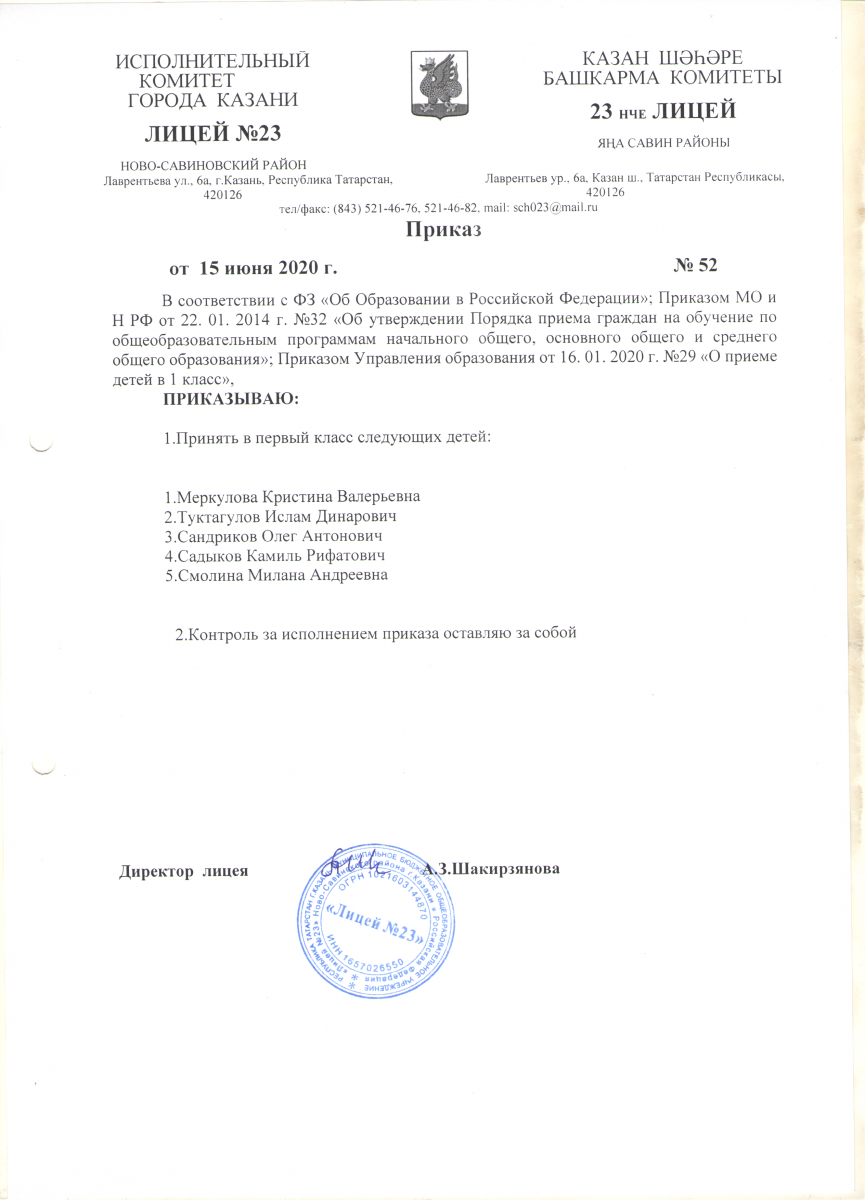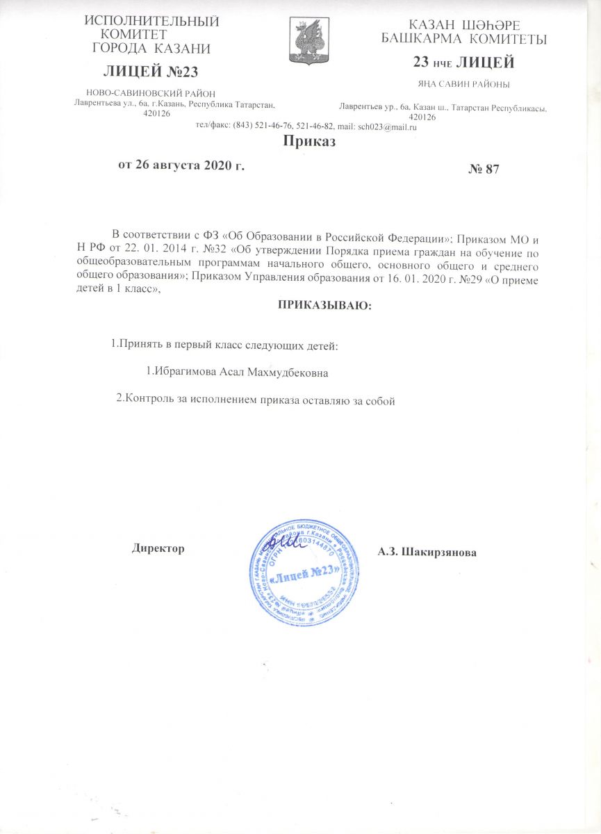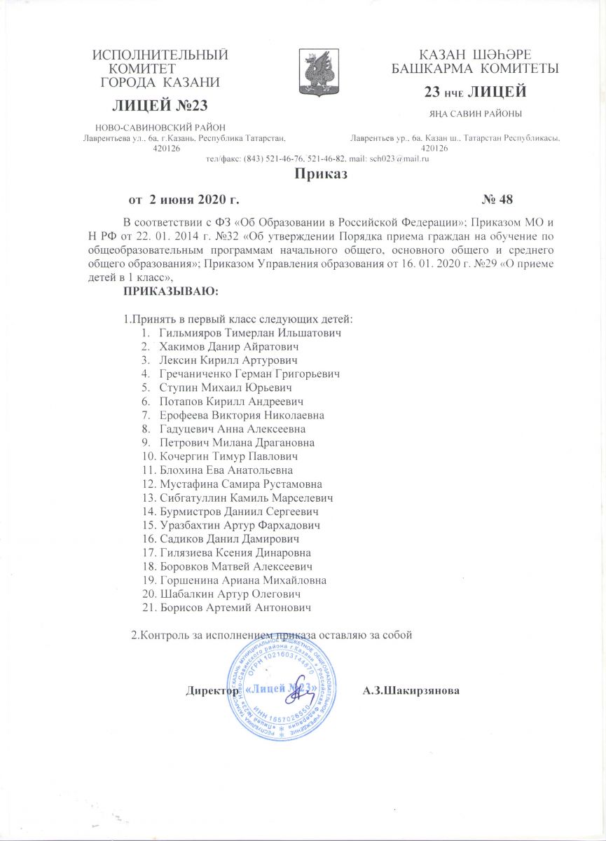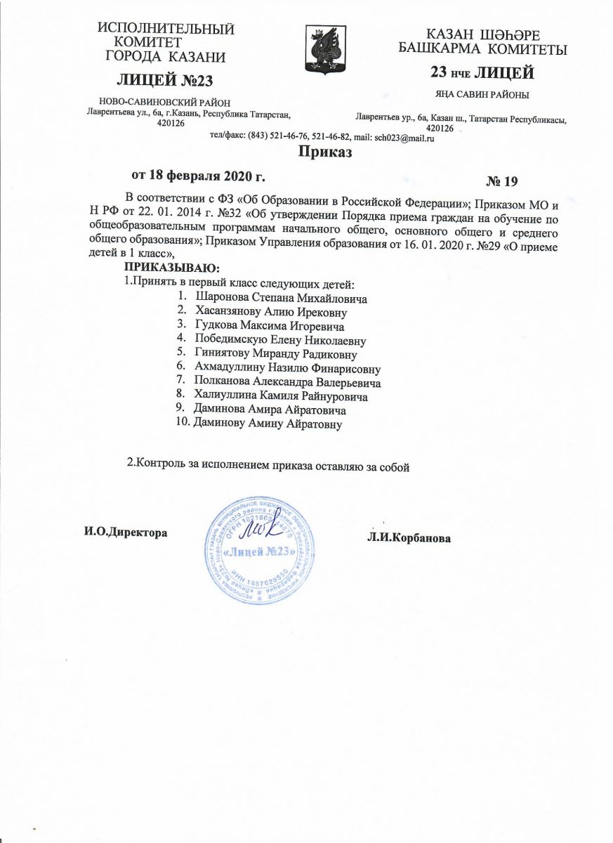 Приказ "О приеме детей в 1 класс МБОУ "Лицей №23"