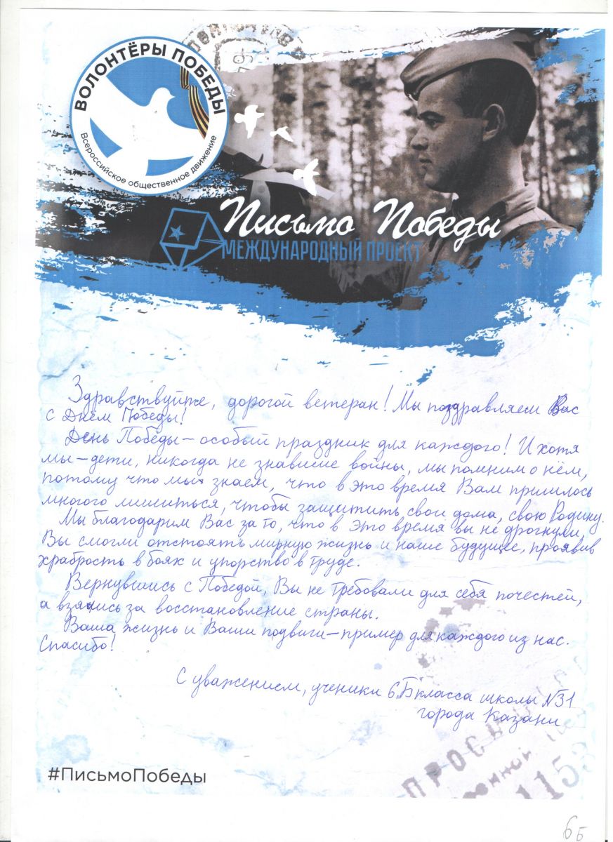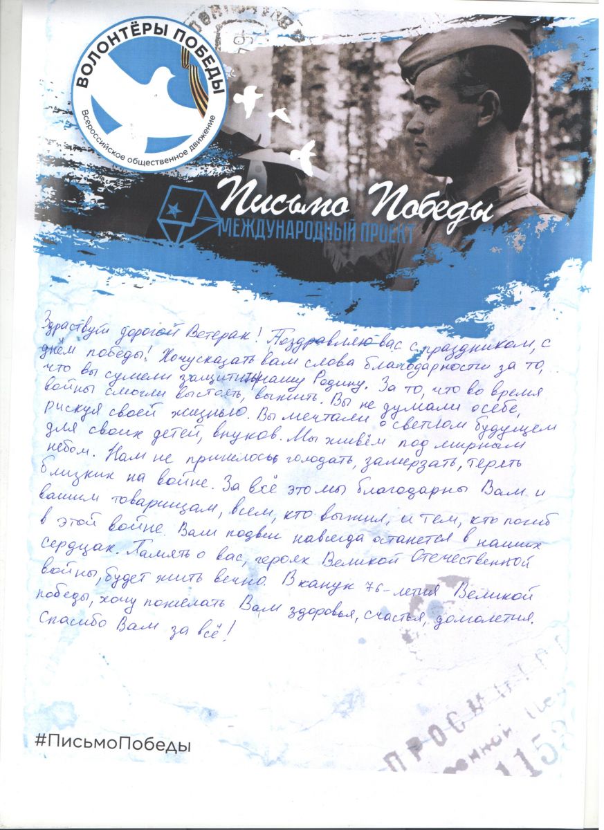 Учащиеся нашей школы поддержали акцию Всероссийского проекта "Письмо Победы ". В ней приняли участие более 300 учащихся, 2-8 классов. Ребята обратились "в прошлое": участникам боевых действий, ветеранам войн.