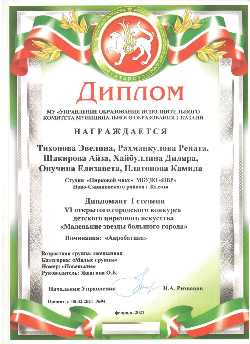 Конкурс детского циркового искусства. 29.04.2021Поздравляем победителей!Тихонова Э., Рахманкулова Р., Шакирова А., Хайбуллина Д., Онучина Е., Платонова К. стали победителями VI открытого городского конкурса детского циркового искусства "Маленькие звезды большого города" (рук. Яшагина О. Б.).Поздравляем! Желаем дальнейших творческих побед!