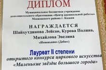 Аплодируем лауреатам! Шайхутлинова Лейсан, Курова Полина, Михайлова Эвелина, стали лауреатами II степени открытого конкурса циркового искусства "Маленькие звезды большого города(руководитель Яшагина О. Б.) Поздравляем!!!