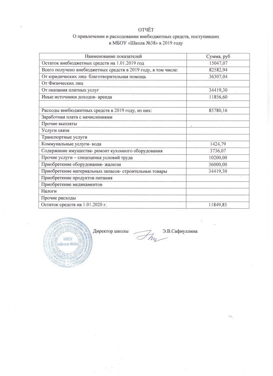 Отчёт о привлечении и расходовании внебюджетных средств, поступивших в МБОУ "Школа №38" в 2019 году