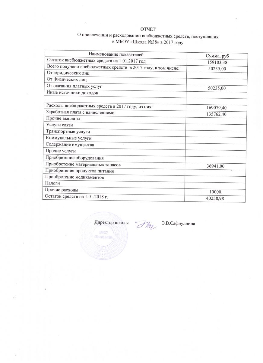 Отчёт о привлечении и расходовании внебюджетных средств, поступивших в МБОУ "Школа №38" в 2017 году