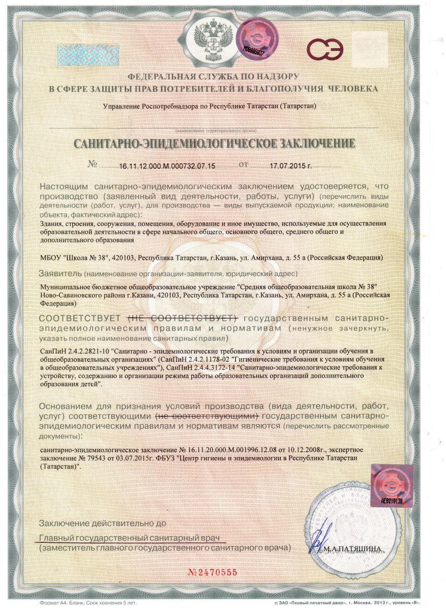 Санитарно-эпидемиологическое заключение от 17.07.2015 г. Работы школы по охране здоровья обучающихся