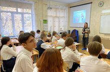 Эльвира Маратовна- специалист по поступлению из учебного центра "Маяк" провел мастер-класс по профориентации для девятых классов.