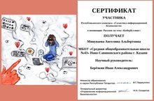 8 А сыйныф укучысы Минуваева Ангелина "Мәгълүмат куркынычсызлыгы галактикасы" республика конкурсының көзге сессиясендә катнашты. Республика конкурсы экстремизм һәм терроризм идеологиясен пропагандалау кысаларында мәгълүмати куркынычсызлык юнәлеше буенча үткәрелә. Без Ангелинаны котлыйбыз һәм аңа киләсе конкурсларда уңышлар телибез!