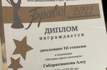 Поздравляем Габдрахманову Алсу, ученицу 7А класс, со званием дипломанта в номинации "История одного экспоната "за участие в Республиканском фестивале-конкурсе "Браво-2021", посвященном году музеев в России.