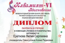 Ученица 8В класса Еретнова Лилия под руководством учителя родного языка Самигуллиной Алины Радиковны приняла участие и завоевала диплом 3 степени в Международном конкурсе речевого и вокального искусства языков народов Поволжья "Илhамият-VI Вдохновение". Поздравляем!